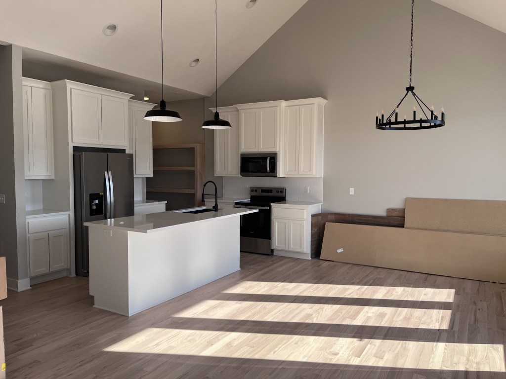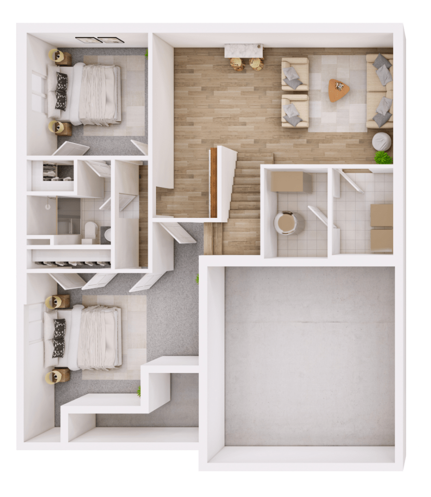 Listed below are our Floor Plans. Each home follows the same layout and includes the same amenities. The main floor consists of the kitchen, master bedroom, secondary bedroom, living room, coat closet, covered back porch and covered front porch. The kitchen comes equipped with a spacious walk-in pantry, fridge, dishwasher, oven and microwave. The finished basement contains 2-bedrooms and bathroom. Along with the laundry room, wet bar, spacious living room storage rooms, and tornado shelter located underneath the stairs.
